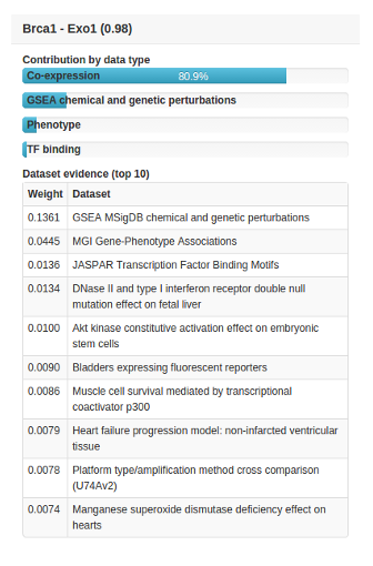The relationship confidence between Brca1 and Exo1 is close to 1 (0.98), which indicates that the prediction is very confident. At the top of the table, horizontal bars represent the proportional contribution of different types of datasets. In this example, the predicted relationship between Brca1 and Exo1 is mostly based on co-expression in microarray datasets (80.9%), but these genes also have evidence of functional relationship in three other datasets. The top individual dataset contributions are also displayed, here showing that the non-expression datasets are individually the strongest evidence for the edge, while the large number of expression datasets with relatively weaker evidence in each dataset contribute most of the evidence when taken together.