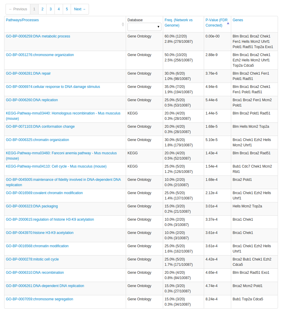 The enriched terms help to interpret the network of query and related genes. In this case, the most enriched terms reflect the role of Brca1 and Brca2 in DNA repair, and it's unsurprising that many of the related genes would also be involved in DNA repair and other DNA replication processes. The related genes that are shown in the network but not annotated to an enriched GO term could be candidate genes for additional experiments to see if they are involved in these processes or are functionally related in some other way.