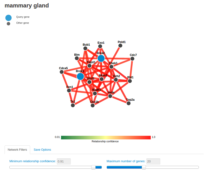 The network displayed indicates the most functionally related genes to Brca1 and Brca2 in the mammary gland.