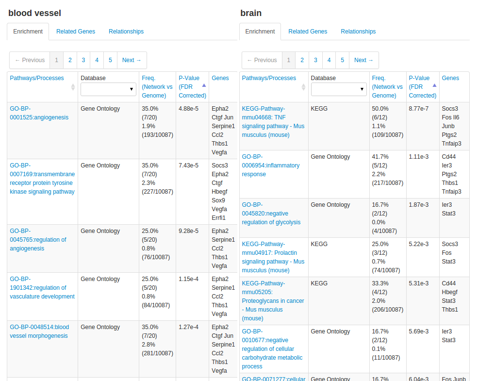 2.3 Checking the "show gene tables" checkbox reveals the gene set enrichment tables for the query and related genes in each tissue: