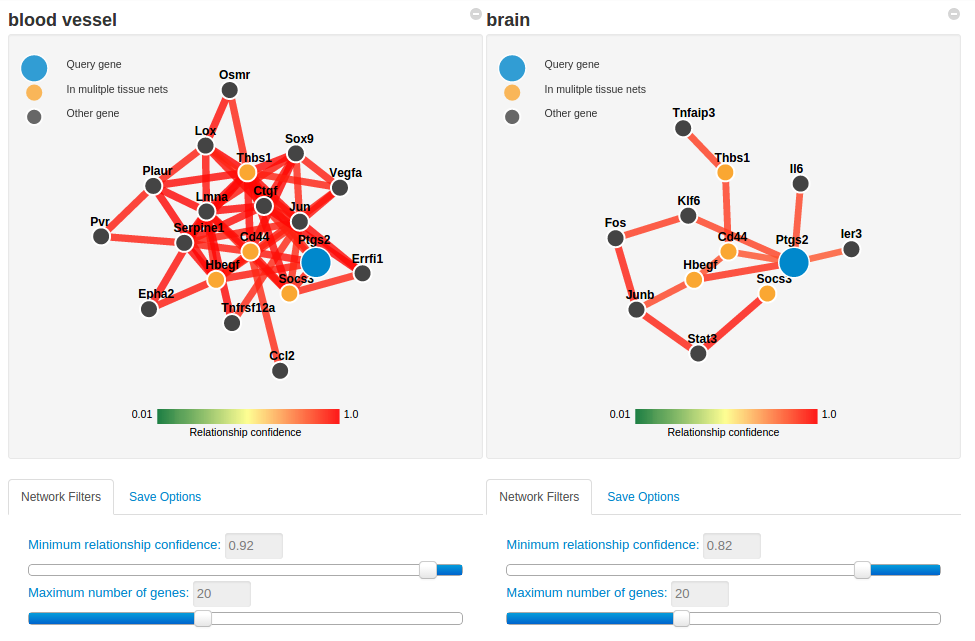 Even though the researcher has not specified the processes they are interested in, the tissue-specific networks reflect that Ptgs2 has different roles in different tissues by predicting functional relationships between Ptgs2 and many angiogenesis genes in the blood vessel network, and many inflammatory response genes in the brain network. If the researcher is specifically interested in epilepsy, they may want to screen the other related genes in the brain network and use the related genes in the blood vessel network as a control, possibly in combination with a Ptgs2 inhibitor.