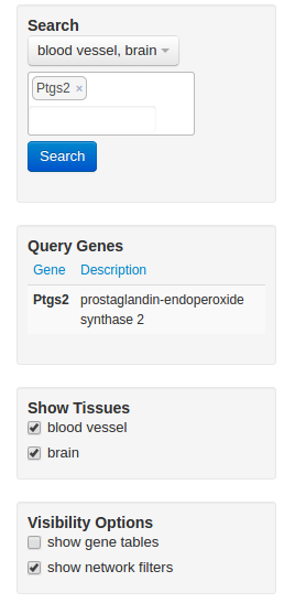 2.1 In this example, a translational researcher is interested in the role of Ptgs2 in epilepsy, and would like to identify candidate genes to study that may be functionally related to Ptgs2 specifically in the brain. As Ptgs2 is also known to promote angiogenesis, the researcher queries for Ptgs2 in both the brain and blood vessel tissue networks
