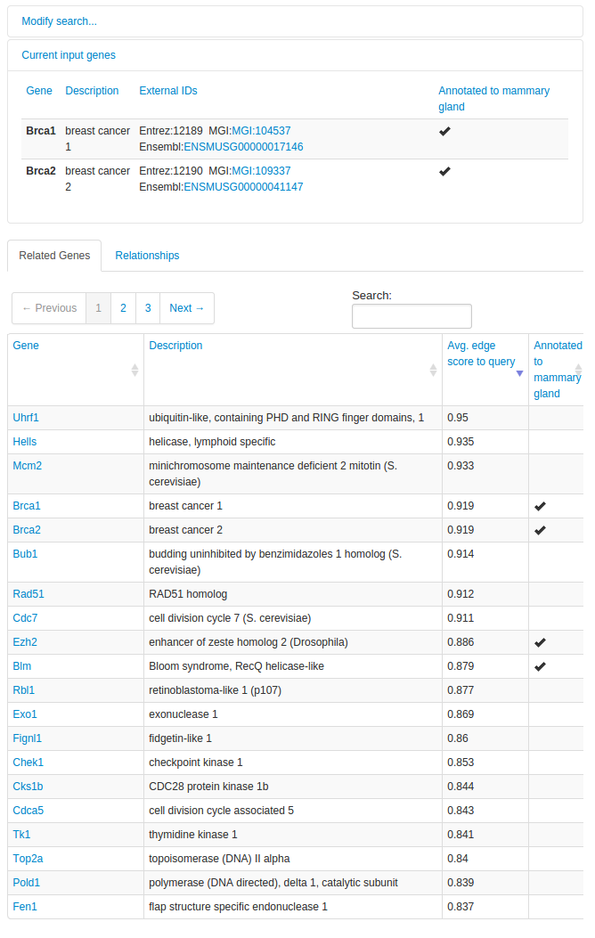 All of the related genes are listed in the "Related Genes" table, with columns indicating the average relationship confidence to the query genes and whether the gene is annotated to the tissue according to MGD-GXD.